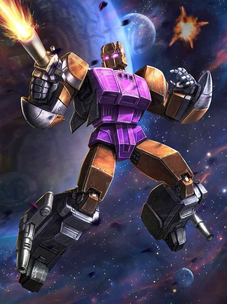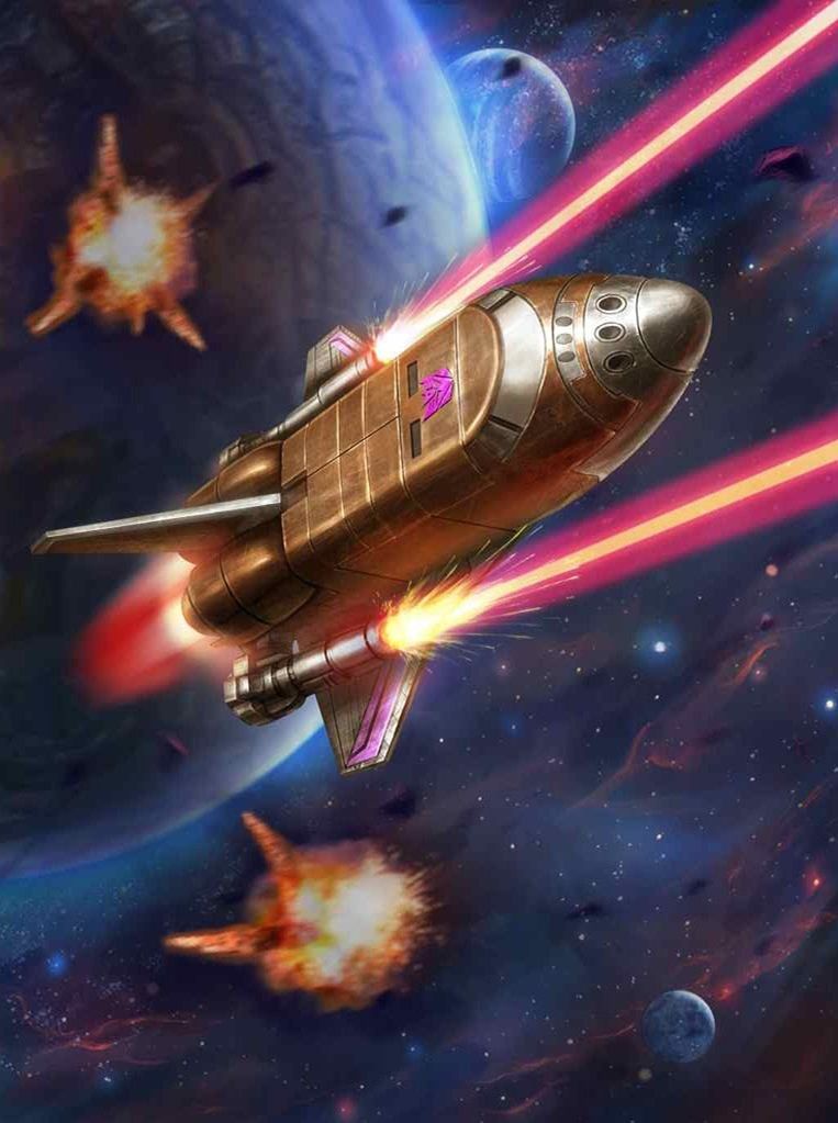 Feels literally and figuratively above the other Transformers as he soars through outer space. Aristocratic, aloof - disguises his long distance loneliness. Cruelly efficient at raining destruction on Earth. Flies at 26,000 mph, stays in orbit for 8 months. Shoots powerful X-ray laser to hit target 12,000 miles away. In robot mode, uses ionic blaster. Combines with fellow Combaticons to form "[Bruiticus]".