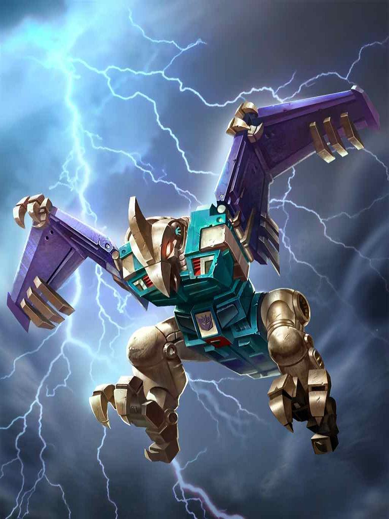 Not a trace of mercy can be among his microchips. Insatiable lust for destruction. In battle, lashes out with wings, beak and claws to cut everything to ribbons. In creature mode, can leap 4 miles in one jump, breaths flame. In robot mode carries double-barreled magnetizer that oppositely charges any metal target so it tears itself apart. Combines with fellow Terrorcons to form Abominus.