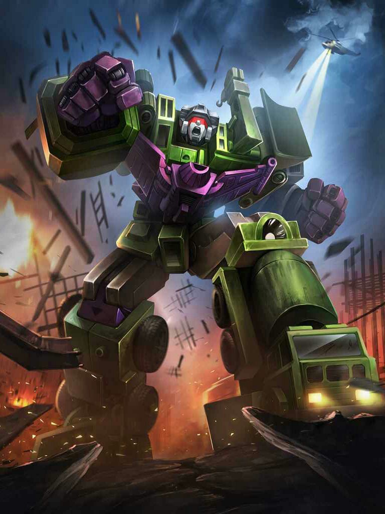 Awesome and terrifying, a bizarre combination of six Constructicons: Scrapper, Scavenger, Bonecrusher, Hook, Long Haul and Mixmaster. Pure brutality - sole purpose is to crush all in his path. His mind is a melding together of his six parts, but limited by their competing thoughts. Enormous height, incredible strength - can knock down a bridge with one punch. Has 10,000°c solar energy beam rifle. Slow, awkward, not too bright.