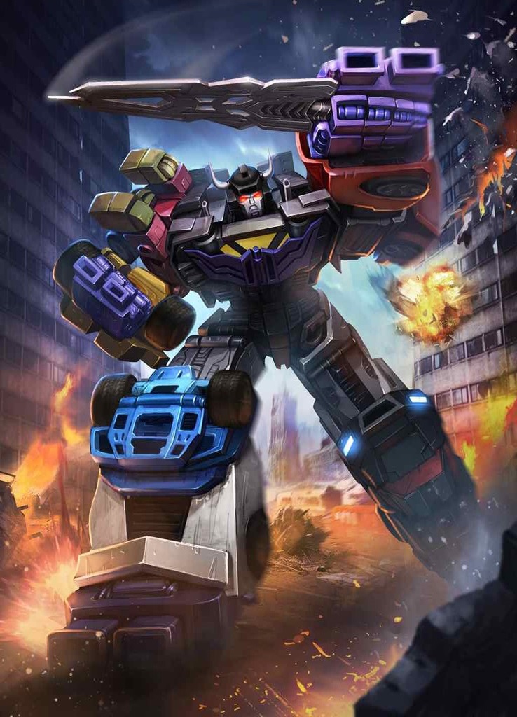 A clanking, crushing terror that destroys all in its path - the ultimate Decepticon weapon if he wasn't so confused by the opposing thoughts of the 5 Stunticons who comprise him. (Motormaster is loathed by the other four). Tremendous strength, his punch has the force of 140 tons. Impervious to most artillery. Users Motormaster's cyclone gun and carries an ionizer sword with a 50,000 volt charge.