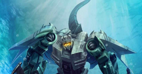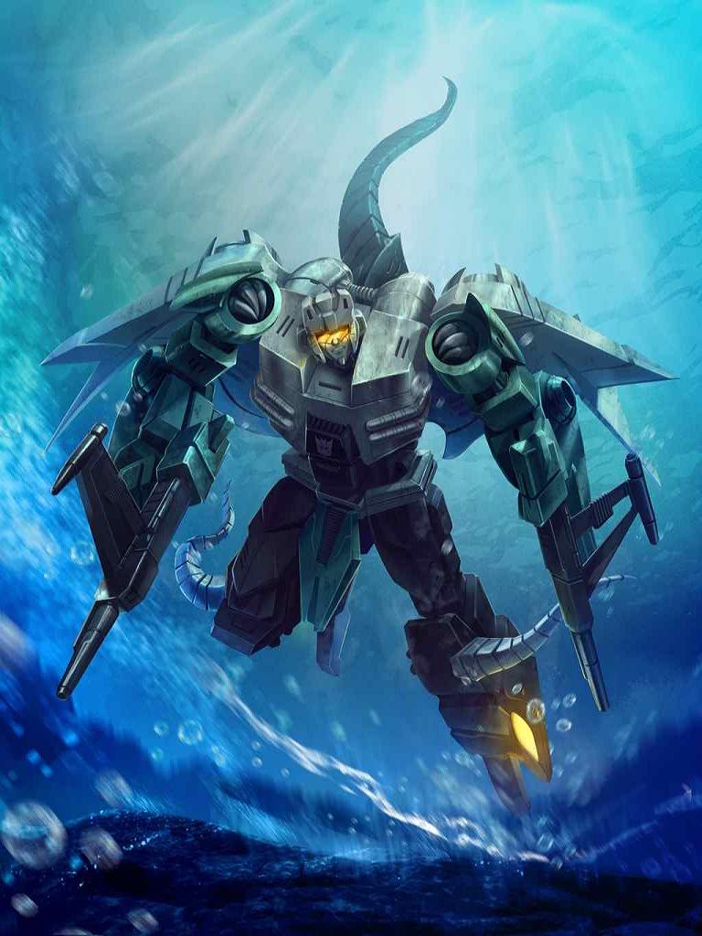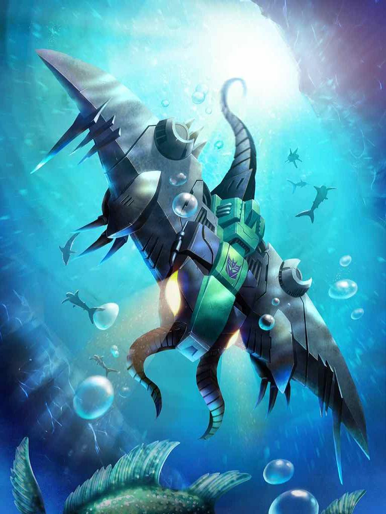 Glides through the seas like a sinister steel specter. Enjoys surprising and then destroying his targets. Nothing escapes his notice... or his grasp. Equipped with electrical, chemical and infrared sensors, long range sonar. converts to dual proton blaster in weapons mode. Underwater can detect and home in on anything living or moving within a 20 mile radius. Maximum speed 110 mph. Armed with double venom lasers in robot mode that paralyse on contact. Combines with fellow Seacons to form [Piranacon].