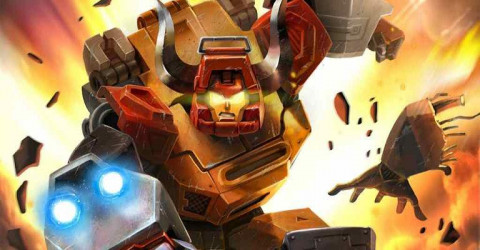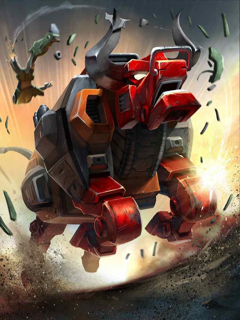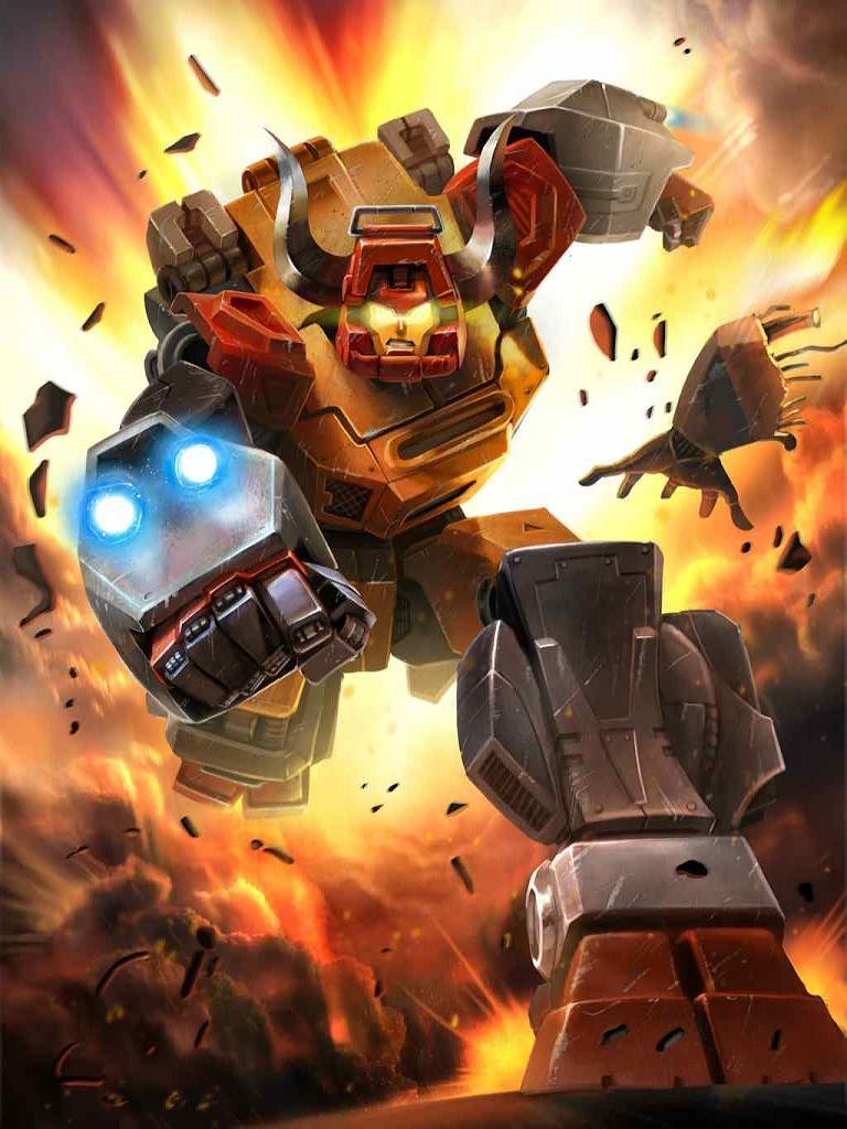 Prefers brute force over reason. Steam comes from his nasal ducts when he's enraged. Smashes head-first into highway trestles and small buildings to relieve his aggression. Always feels better afterwards. Carries four exterior fuel tanks, capacity 1600 gallons, as a reserve for himself and his comrades. His horns shoot bolts of 20,000 volt electricity. Carries a catalytic carbine that shoots destructive chemicals, and an electro-sword. Combines with fellow Predacons to form [Predaking].