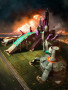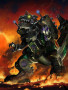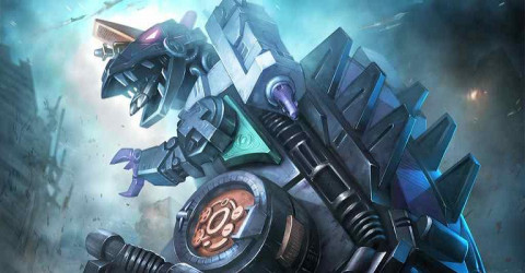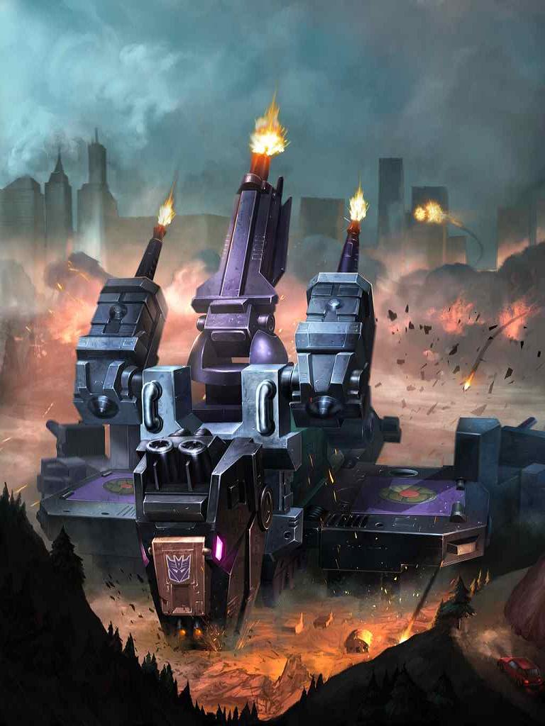 Doesn't stop blasting until he's hip deep-deep in smoking rubble. Completely without mercy. The most lethal fighting machine devised by the Decepticons. In dinosaur mode, jumps 20 miles with rocket backpack. Shoots heat-seeking plasma bombs from mouth and mind-controlling hypno-beam from optical sensor. As City, has landing and repair bays, communications centre and rotating scanners. In mobile battle station mode, has laser cannon, rotating blasters, destructo-beams and dual photon launchers.
