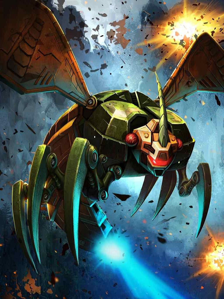 Will use his poisonous talents even on fellow Decepticons because he trusts no one and suspects everyone is trying to usurp his role as leader. His stinger can discharge fluids harmful to mechanical and organic life; corrosive acids, destructive catalysts, paralyzing toxins and others. Stinger can penetrate 1/4 inch steel, but sometimes gets stuck and breaks off. Flies at 15 mph for 300 miles. Carries electro-blaster gun in robot form.