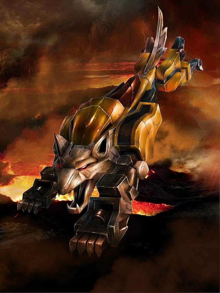 Cruel, vicious, but apparently built with a few wires crossed. Talks to himself in a sing-song backward way: "Destroy the Autobots I shall. Tear them to scrap metal I will." Binary-bonded to Monzo a brutish professional hyperwrestler - turned underworld nightclub owner. In robot mode, uses photon pistol and thermal sword. In wolf mode, nose module is equipped with various tracking sensors. Can leap .8 miles.